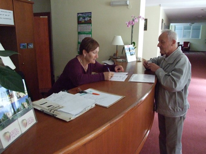 K1_02 Błażej (organizator) w recepcji "dopasowuje" pokoje dla przybyłych.